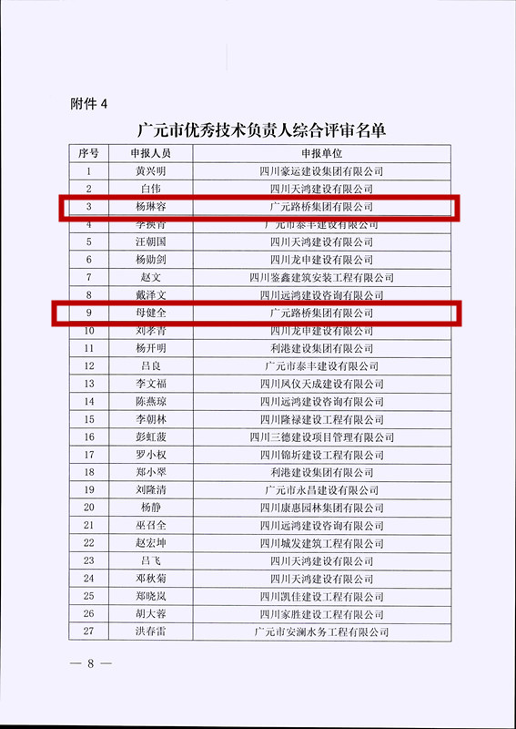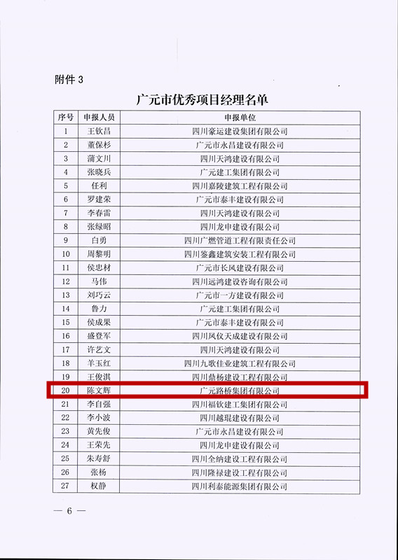 2023年7月1日,廣元路橋集團(tuán)有限公司被廣元市住房和城鄉(xiāng)建設(shè)局評(píng)為優(yōu)秀建筑企業(yè);陳文輝被評(píng)為“廣元市優(yōu)秀項(xiàng)目經(jīng)理”;母健全、楊琳容被評(píng)為“廣元市優(yōu)秀技術(shù)負(fù)責(zé)人”。