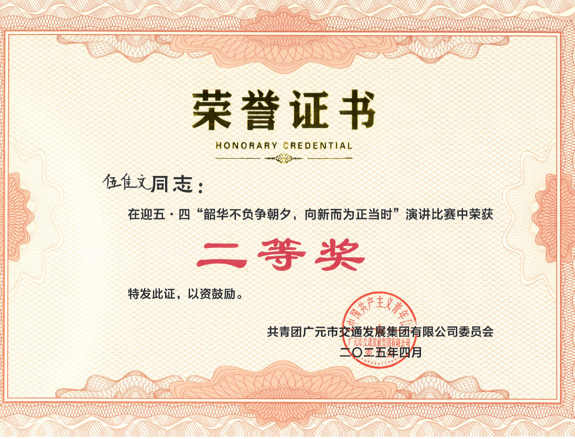憑借極具感染力的舞臺(tái)表現(xiàn)和真摯動(dòng)人的內(nèi)容表達(dá),伍佳文同志從眾多選手中脫穎而出,榮獲二等獎(jiǎng)佳績(jī)。