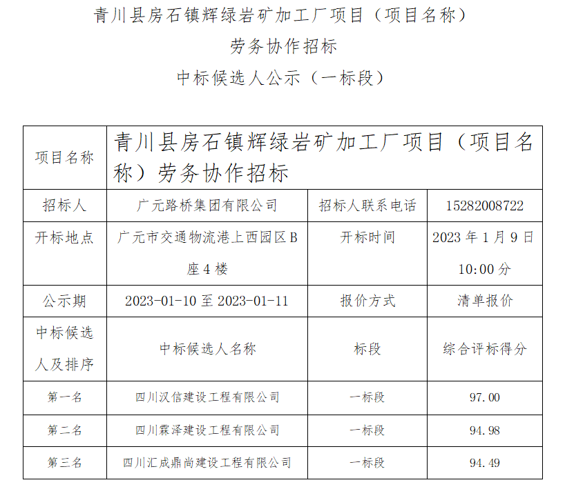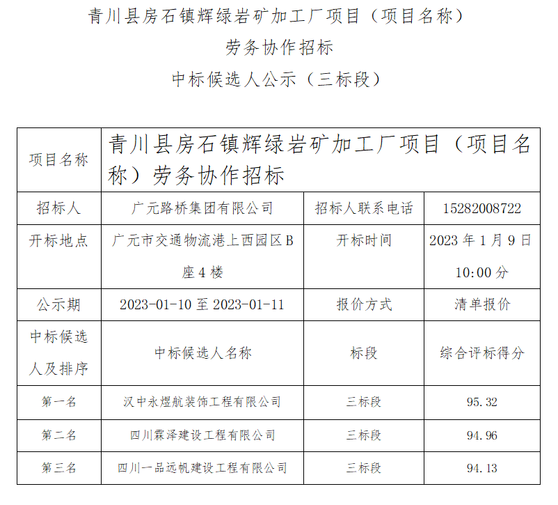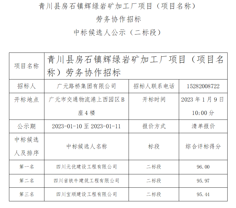 青川縣房石鎮(zhèn)輝綠巖礦加工廠項目(項目名稱) 勞務(wù)協(xié)作招標(biāo)中標(biāo)候選人公示